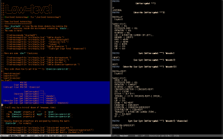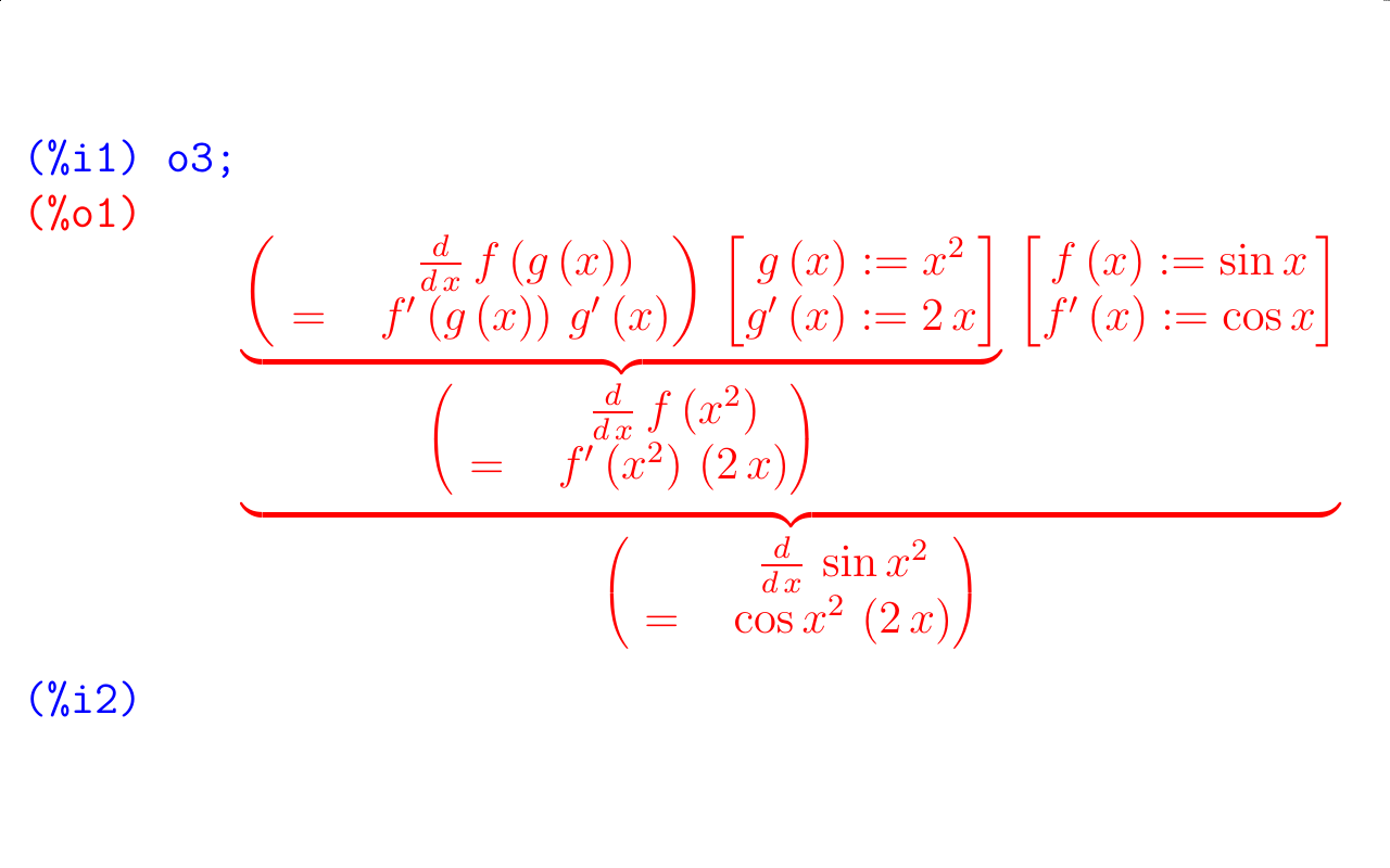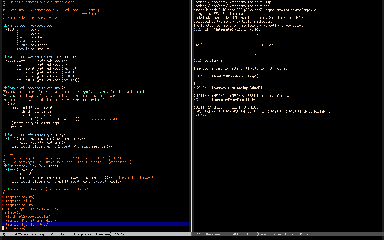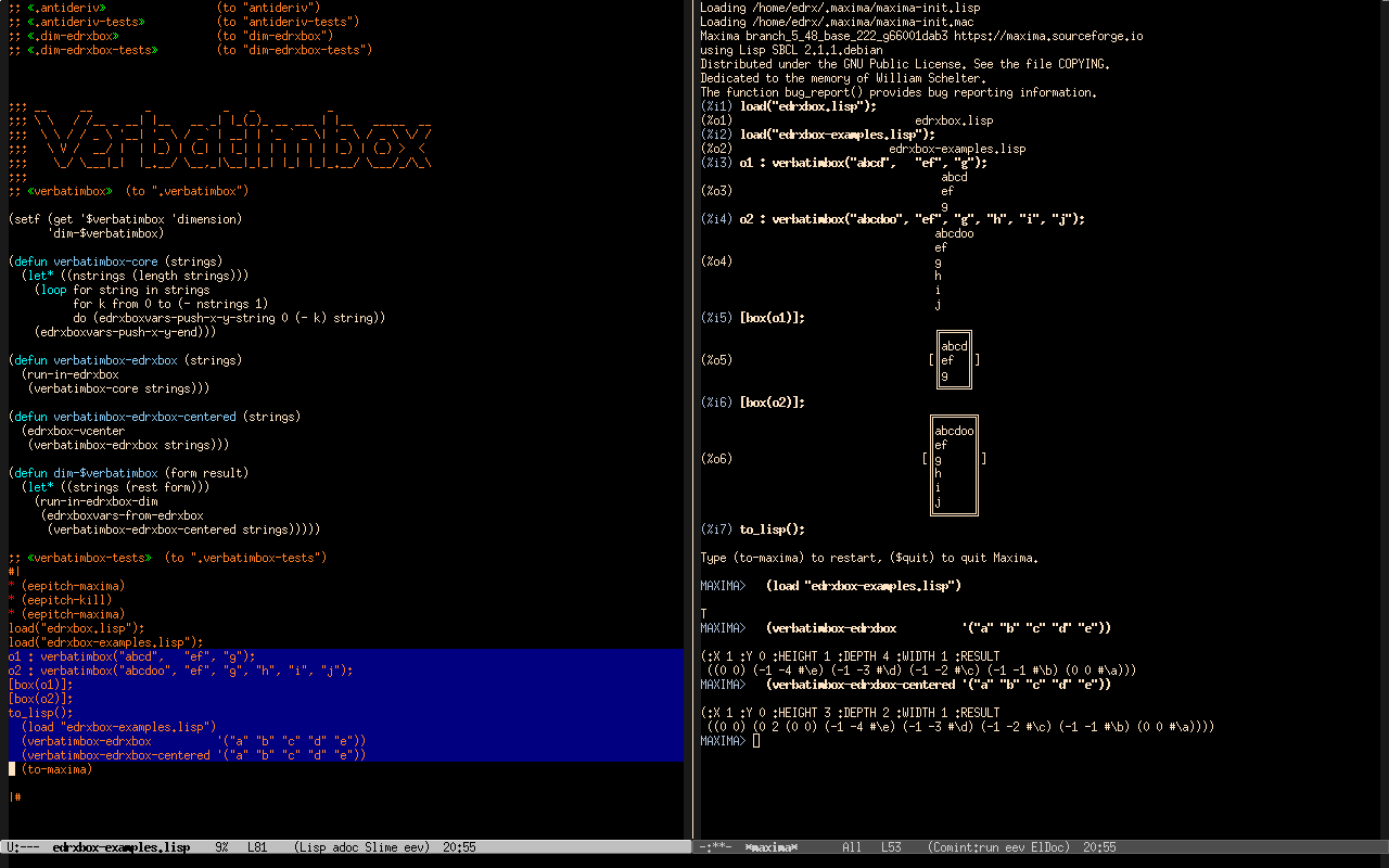 In Emacs they will point to specific lines in the Maxima source, like in this screenshot: but in the htmlized version of edrxbox.lisp their pos-spec-lists don't work, and the links point to the top of the files in the git repository. 4. The examples: edrxbox-examples.lispThe file edrxbox-examples.lisp is much more interesting... it has these examples: 4.1. VerbatimboxVerbatimbox is used by lisptree: Note what was needed to center the drawing around the baseline - just a call to `edrxbox-vcenter', that added a "move" command to the drawing instructions. 4.2. AntiderivThe first two screenshots below show `antideriv' and `hdw'. `hdw' creates a box with a certain height, depth, and width; I use it mostly to debug `dim-*' functions. The third screenshot below shows a comparison between the `antideriv' written with edrxbox and its antecessor, dim-antideriv.lisp: 4.3. UnderbraceThe next screenshot shows `underbrace' - note how the horizontal centering was done by just calling `edrxbox-hcenter' - and a demo that uses my substitution operator, `_s_', and these variants of it. The second screenshot shows how these underbraces are LaTeXed - see the introduction. 4.4. Displaying edrxboxesRemember that in a previous section we saw a debugging function, `edrxbox-from-form', that displays the drawing instructions for a given Maxima object. Here is its screenshot again: The next example is another debugging function, `edrxbox-display', that receives an edrxbox, converts its drawing instructions into a Maxima object - whose associated `dim-*' function is `dim-edrxbox' -, and makes Maxima display it. The conversion is explained in the first two screenshots below, ...and the third screenshot shows what can happen when we don't run `edrxboxvars-push-x-y-end' to move the current (x,y) position to the "right" ending place. This is related one of my motivations for writing edrxbox.lisp, by the way... see this bug report, that describes a similar bug that took us months to fix, and the explanations in the beginning of edrxbox.lisp, that have this paragraph: