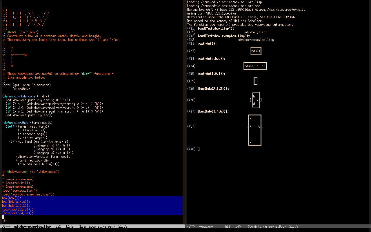 ...and then run the tests and examples in its test blocks. The next sections explain what its tests and examples do. 3. The core: edrxbox.lispThe file edrxbox.lisp has lots of explanations, and it has only a handful of (boring) test blocks that demonstrate low-level things... these ones, starting on the second screenshot: It also has lots of links to displm.lisp and displa.lisp. To make them work in Emacs you need a `code-c-d' like this one: